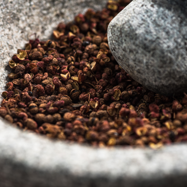香りの山椒、刺激の花椒。異なる土地で育ち、ひとつの痺れに辿り着いた。“国境を越えた旨痺れ”のブレンド。その品格を、いま一瓶に。